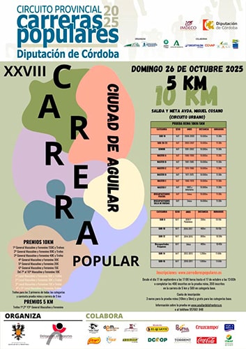 La Carrera Popular Aguilar de la Frontera está organizada por el Ayuntamiento de Aguilar de la Frontera y se celebrará el 26 de octubre de 2025.
