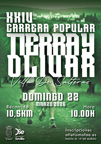 La Carrera Popular Salteras «Tierra y Olivar» está organizada por la Delegación de Deportes del Ayuntamiento de Salteras y se disputará el 22 de marzo de 2026.